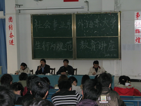 3月31日下午两点,社会事业系、外语系在2号教学楼316教室举行大学生行为规范教育讲座。该系主任王诚、副主任石望东、全体辅导员、班主任及全体男生参加了本次讲座。讲座由该系团总支书记汪江红主持。 系副主任石望东从当代大学生的任务、特点、需要注重“知识、能力、健康”三大法宝以及需要处理好的关系四个方面生动的阐述了大学生遵守行为规范的重要性与必要性。 会上,系主任王诚做了总结讲话,他指出:举行这次大学生行为规范教育讲座对同学们来说十分有必要,大学生良好的日常行为规范的养成是成长、成人、成才、成功的重要保证,同时对同学们提出了以下几点要求:一要遵守学校的行为规范制度;二要有积极向上、朝气蓬勃的精神状态;三要善于学习,学好自己的专业知识,提高能力;四要贵在坚持,从小事做起,从每一天做起,这样才能成人成才,最后取得成功。 这次讲座使同学们充分认识到了培养良好的规范行为的重要性和必要性,会后同学们纷纷表示要规范了自己的日常行为,养成良好的学习习惯、卫生习惯、劳动习惯,做一个有理想、有道德、有文化、有纪律的新时代大学生。
