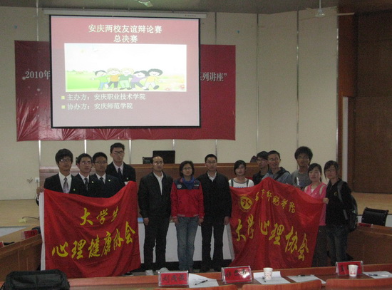 2010年4月10日下午两点两校友谊辩论赛总决赛在我院图文信息中心一楼报告厅举行,两校各派出一支精英队伍参加辩论。院团委余锋老师、王晓林老师、心理咨询室何世亮老师以评委身份出席了此场比赛,比赛期间辩论激烈精彩却不失友谊,特别是自由攻辩阶段,双方攻守激烈,赢得场下观众阵阵掌声与好评。辩论结束后评委老师给予了双方精彩的点评,最终我院代表队获得冠军,安师院代表队二辩吕良同学获得“最佳辩手”称号。辩论结束后双方辩手互相交流经验并与评委老师们合影留念,同学们都表示两校学生团体的交流与合作将会一如既往的进行下去,两校友谊长存。