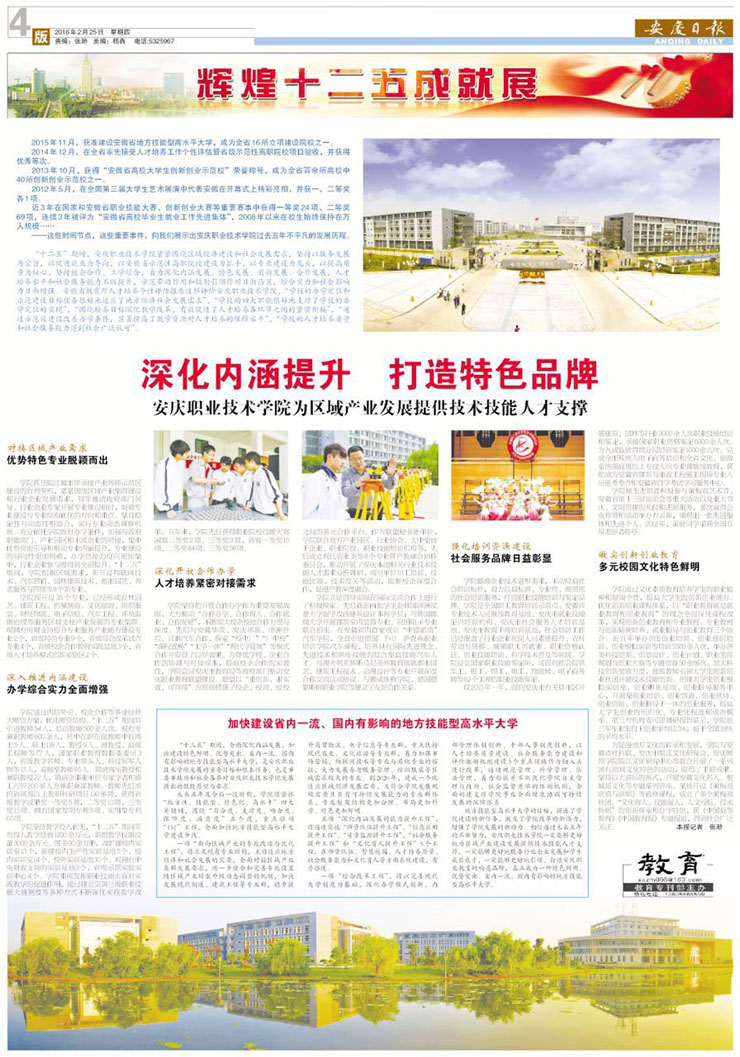 2016年2月25日,《安庆日报》“辉煌十二五成就展”栏目以《深化内涵提升 打造特色品牌 久久久一区二区三区|亚洲精品一区二区三区不|久久av网|精品国产一区二区三区久久久久久|午夜精品av|久久久久久久久久久久久久av|日韩亚洲欧美综合为区域发展提供技术技能人才支撑》为题,专题报道我院“十二五”时期改革发展情况,并介绍我院“十三五”时期加快建设地方技能型高水平大学的思路和举措。
