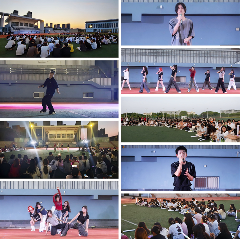 暮色渐浓,微风轻拂着操场的草坪,主持人宣布草地音乐节开始,开场舞《whiplash》音乐响起,由李欣怡带队身着闪亮演出服的舞者们用充满张力的动作瞬间点燃现场气氛。歌唱环节更是惊喜连连,24计算机应用技术1班余佳旺用《第一次爱的人》唤起青春记忆;23大数据技术一班贾梦磊演唱《修炼爱情》,细腻歌声直抵人心;23计算机网络2班王兆丰的《安静》、24数字媒体4班叶思琪的《新贵妃醉酒》等,或深情舒缓,或风格独特,同时台下观众挥舞荧光棒,跟随节奏合唱,操场化作一片音乐的海洋。