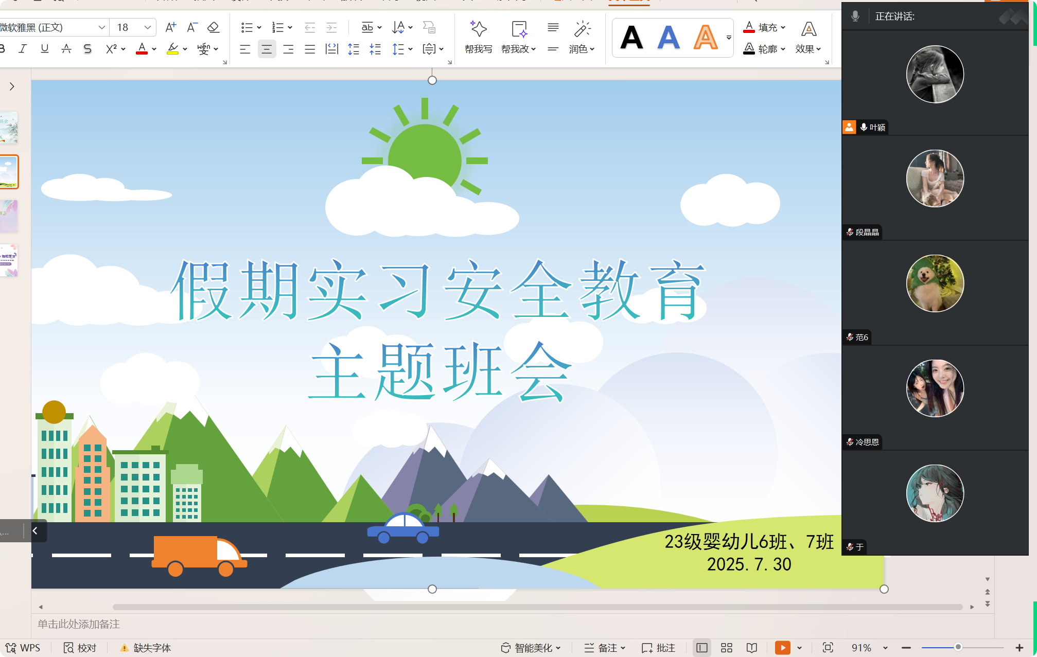 本次班会聚焦防溺水、防诈骗、实习安全、心理健康、交通安全等重点领域,采用案例讲解、互动问答等生动形式,将安全知识转化为可操作的行动指南。老师们结合暑期高频风险场景深入剖析隐患,针对暑期兼职学生讲解“实习环境安全”“合同签订陷阱”等实用技巧;针对高温天气详细解析防溺水自救方法;针对网络诈骗系统梳理各类网络诈骗套路等。24酒店管理、早期教育等班级创新设置“安全知识打卡”环节,学生与家长共同学习并适时反馈,辅导员即时答疑,实现家校联动共学。