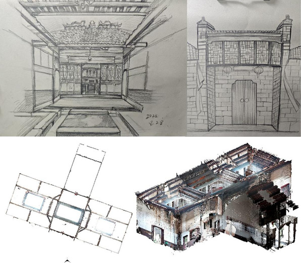 为将“进士第”的现状数据保存下来并更好地挖掘蕴含的古建文化与知识,团队采用测绘无人机与三维激光扫描仪等设备对古建现状进行全方位的测绘扫描,同学们应用专业软件构建了古建的现状模型、建筑平立剖现状图,用数字化存档的方式将古建数据保存了下来。为进一步挖掘“进士第”古建的价值,团队发挥专业绘画的技能,将“进士第”的典型构件巨幅雕花、斗拱雀替等以速写的方式现场记录下来。