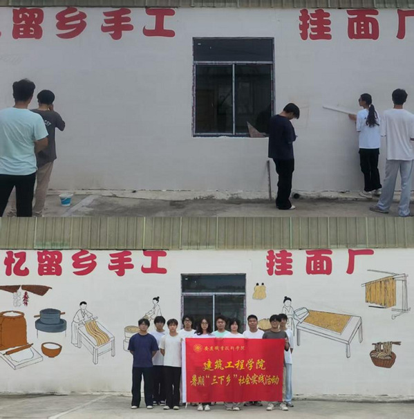 8月28日至30日,在平岭村忆留乡手工挂面加工厂内,一幅32平方米的彩色墙绘正悄然成型。建筑工程学院“青春画笔,点亮乡途”实践团的青年学子们,以汗水为墨、专业为笔,将传统手工挂面的制作流程描绘下来,用艺术实践书写乡村振兴的青春答卷。
