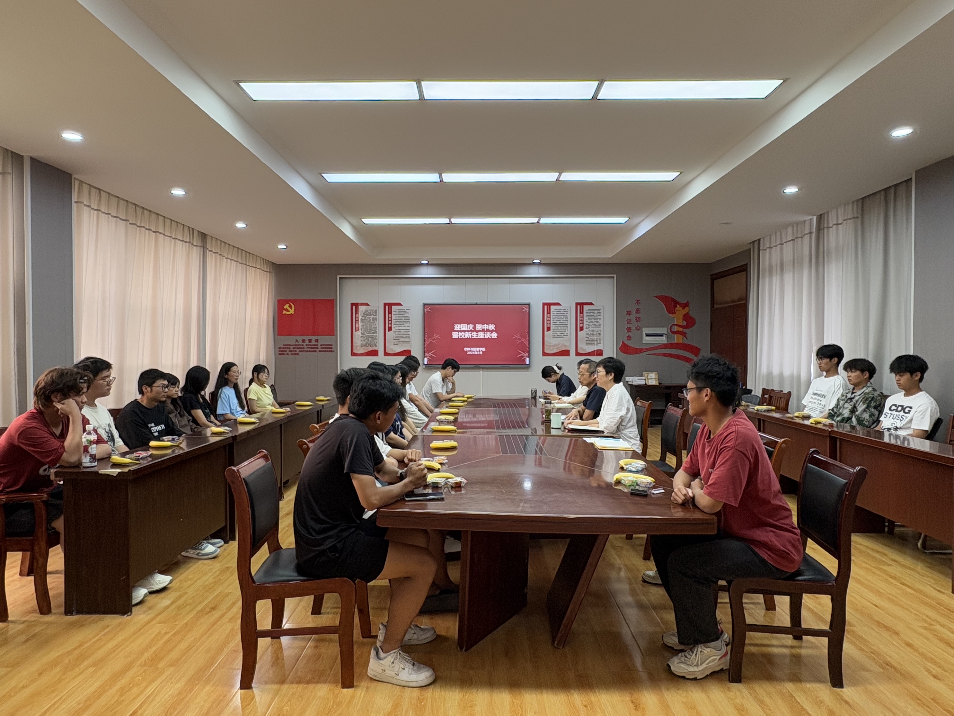 为切实保障留校学生的安全,了解学生需求,传递学院关怀,9月30日,农林与服装学院在会议室召开“迎国庆 贺中秋”国庆假期留校新生座谈会。该院党总支书记李进恩、学生工作负责人、2025级新生辅导员以及留校新生齐聚一堂,共话佳节,畅想未来。
